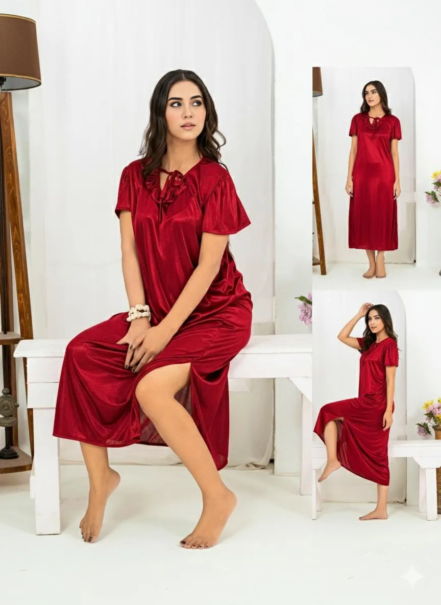 • Fabric: Silk• Pattern: Plain• Neck Type: V-Neck• Available Sizes: Free Size• Number Of Pieces: 1 Pc• Package Includes: 1 x Night Suit• Color: Maroon• Note: There might be an error of 1-3 cm due to manual measurement, and slight color differences may occur as a result of varying lighting and monitor effects.• Product Code: MZ2238200007MMTS