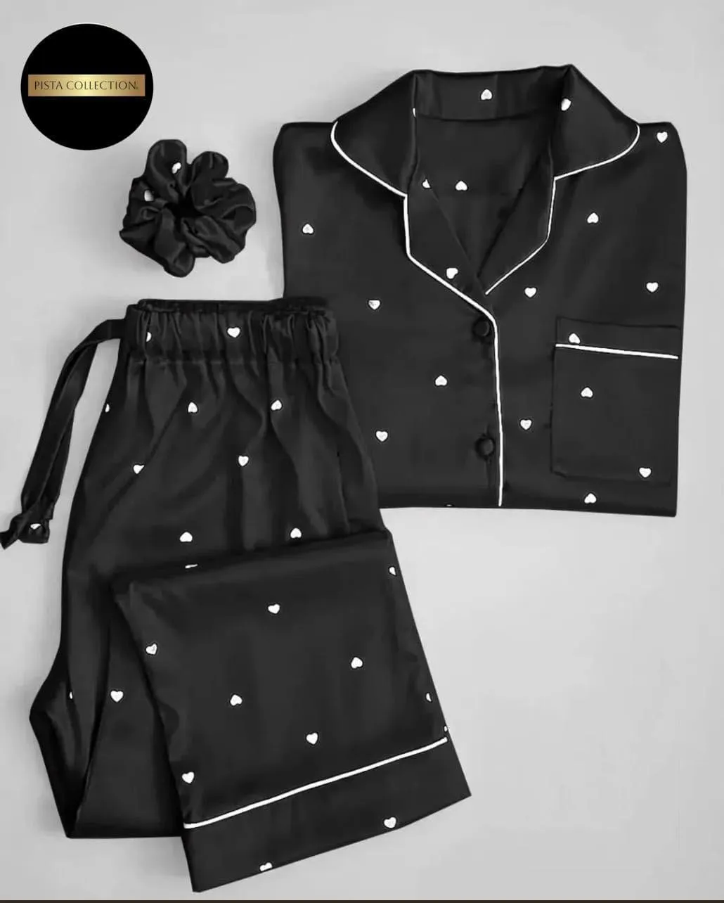 • Fabric: Silk• Pattern: Printed• Neck Type: Round Neck• Available Sizes: Standard Size• Number Of Pieces: 2 Pcs• Package Includes: 1 x Sleep Shirt, 1 x Sleep Trouser• Shirt Length: 30 Inches• Shirt Chest: 20 Inches• Trouser Length: 38 Inches• Color: Black• Heart Print Piping work on Shirt and Trouser Night Suit 3PCs• (With scrunch)• Size Measurement• Chest 20• Shirt Length 28/ 30• Trouser Length 38• Stuff Silk• Note: There might be an error of 1-3 cm due to manual measurement, and slight color differences may occur as a result of varying lighting and monitor effects.• Product Code: MZ1354200790PACN