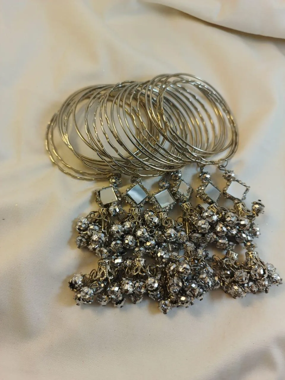 Glamorous and Elegant Steel Bangles Set with Mirror-Worked & Silver Crystal Tassels Double Jhumki Latkan