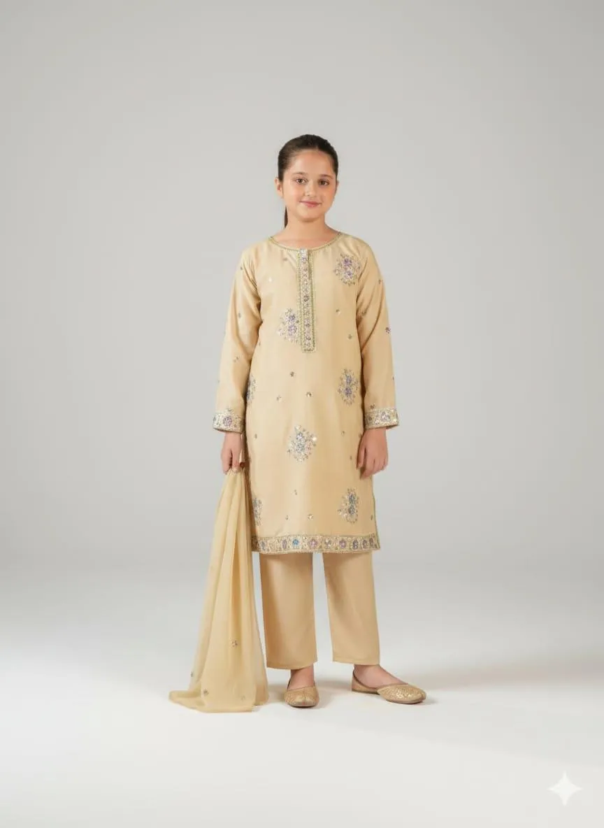 • Material: Lawn• Pattern: Embroidered• Gender: Girl's• Available Sizes: 3-4 Years, 5-6 Years, 7-8 Years, 8-10 Years• Number Of Pieces: 3 Pcs• Package Includes: 1 x Shirt, 1 x Trouser, 1 x Dupatta• Color: Beige• Note: There might be an error of 1-3 cm due to manual measurement, and slight color differences may occur as a result of varying lighting and monitor effects.• Product Code: MZ444200431GR