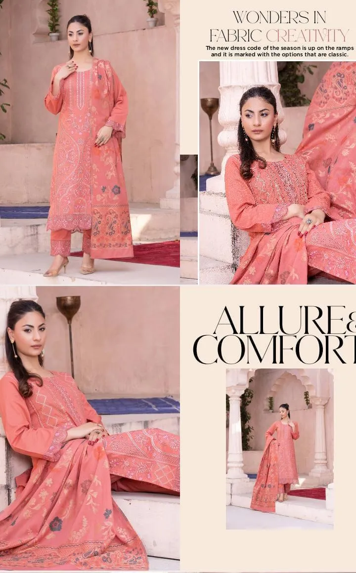 • Shirt Fabric: Lawn• Pattern: Chikankari Embroidered• Shirt Front Pattern: Sequins Embroidered• Neckline: Embroidered• Sleeves Pattern: Embroidered• Daman: Patch Work• Shirt Back Pattern: Plain• Trouser Fabric: Lawn• Trouser Pattern: Embroidered• Dupatta Fabric: Jacquard• Dupatta Pattern: Digital Print• Number Of Pieces: 3 Pcs• Package Includes: 1 x Shirt, 1 x Trouser, 1 x Dupatta• Shirt Cutting: 3 Meter• Trouser Cutting: 2.5 Meter• Dupatta Cutting: 2.75 Meter• Color: Pink• ? Original Stock• Note: There might be an error of 1-3 cm due to manual measurement, and slight color differences may occur as a result of varying lighting and monitor effects.• Product Code: MZ59000002346RABG