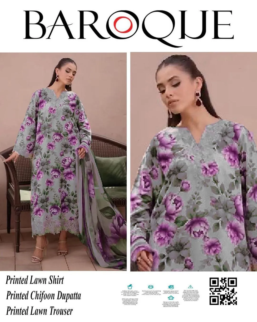 • Shirt Fabric: Lawn• Pattern: Digital Print• Shirt Front Pattern: Digital Print• Neckline: Printed• Sleeves Pattern: Printed• Daman: Printed• Shirt Back Pattern: Printed• Trouser Fabric: Lawn• Trouser Pattern: Block Printed• Dupatta Fabric: Chiffon• Dupatta Pattern: Digital Print• Number Of Pieces: 3 Pcs• Package Includes: 1 x Trouser, 1 x Shirt, 1 x Dupatta• Shirt Cutting: 3 Meter• Trouser Cutting: 2.5 Meter• Dupatta Cutting: 2.15 Meter• Color: Grey• Note: There might be an error of 1-3 cm due to manual measurement, and slight color differences may occur as a result of varying lighting and monitor effects.• Product Code: MZ59000002418RABG