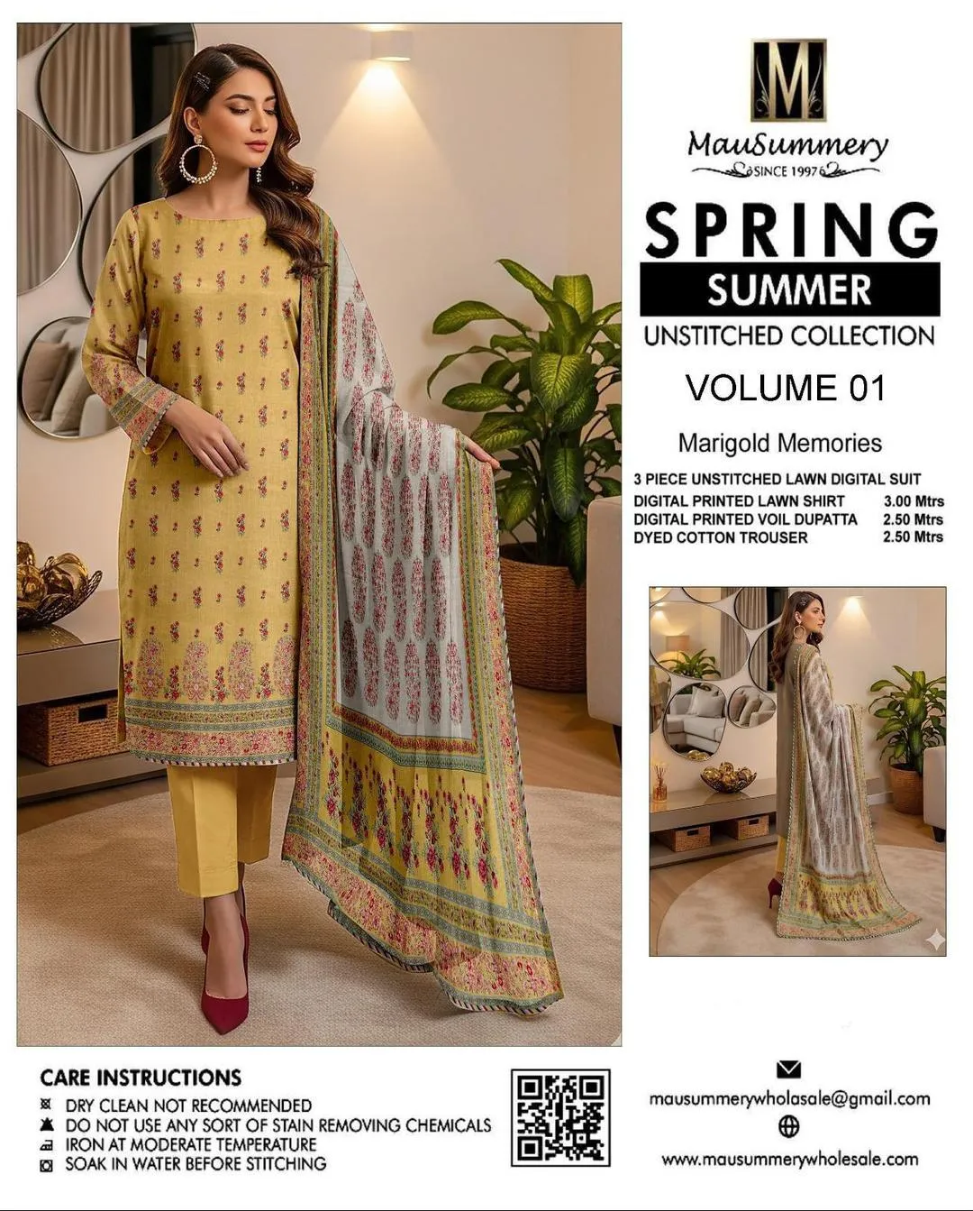 • Shirt Fabric: Lawn• Pattern: Digital Print• Shirt Front Pattern: Digital Print• Neckline: Printed• Sleeves Pattern: Digital Print• Daman: Printed• Shirt Back Pattern: Digital Print• Trouser Fabric: Lawn• Trouser Pattern: Plain• Dupatta Fabric: Lawn• Dupatta Pattern: Printed• Number Of Pieces: 3 Pcs• Package Includes: 1 x Shirt, 1 x Trouser, 1 x Dupatta• Shirt Cutting: 3 Meter• Trouser Cutting: 2.5 Meter• Dupatta Cutting: 2.5 Meter• Color: Yellow• Note: There might be an error of 1-3 cm due to manual measurement, and slight color differences may occur as a result of varying lighting and monitor effects.• Product Code: MZ1599201149UNLECG