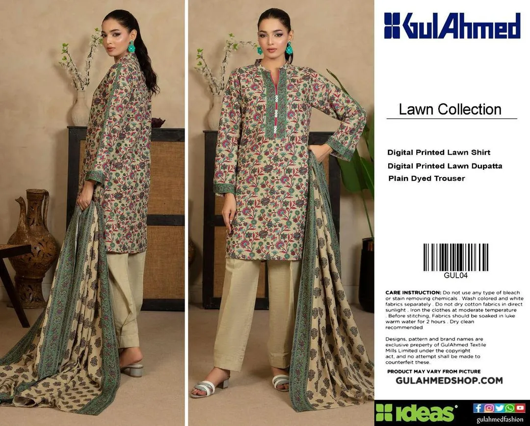 • Shirt Fabric: Lawn• Pattern: Digital Print• Shirt Front Pattern: Digital Print• Neckline: Printed• Sleeves Pattern: Digital Print• Daman: Printed• Shirt Back Pattern: Digital Print• Trouser Fabric: Lawn• Trouser Pattern: Plain• Dupatta Fabric: Lawn• Dupatta Pattern: Digital Print• Number Of Pieces: 3 Pcs• Package Includes: 1 x Shirt, 1 x Trouser, 1 x Dupatta• Shirt Cutting: 3 Meter• Trouser Cutting: 2.5 Meter• Dupatta Cutting: 2.5 Meter• Color: Brown• Note: There might be an error of 1-3 cm due to manual measurement, and slight color differences may occur as a result of varying lighting and monitor effects.• Product Code: MZ1599201168UNLECG