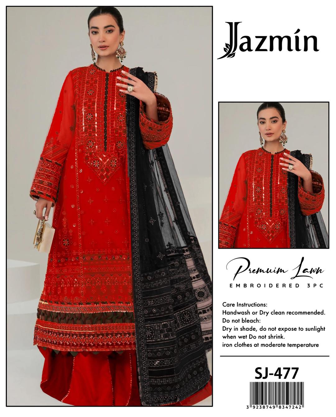 • Shirt Fabric: Lawn• Pattern: Embroidered• Shirt Front Pattern: Embroidered• Neckline: Patch Work• Sleeves Pattern: Embroidered• Daman: Patch Work• Trouser Fabric: Lawn• Dupatta Fabric: Bamber• Dupatta Pattern: Embroidered• Number Of Pieces: 3 Pcs• Package Includes: 1 x Shirt, 1 x Trouser, 1 x Dupatta• Shirt Cutting: 3 Meter• Trouser Cutting: 2.25 Meter• Dupatta Cutting: 2.25 Meter• Color: Red• Note: There might be an error of 1-3 cm due to manual measurement, and slight color differences may occur as a result of varying lighting and monitor effects.• Product Code: MZ65300000409RGML