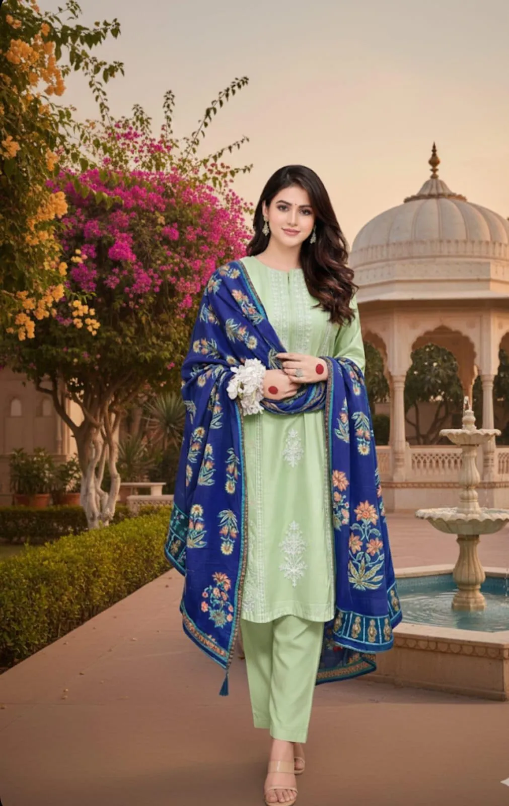 • Shirt Fabric: Lawn• Pattern: Embroidered• Shirt Front Pattern: Embroidered• Shirt Back Pattern: Plain• Trouser Fabric: Lawn• Trouser Pattern: Plain• Dupatta Fabric: Diamond• Dupatta Pattern: Printed• Number Of Pieces: 3 Pcs• Package Includes: 1 x Shirt, 1 x Dupatta, 1 x Trouser• Shirt Cutting: 3.25 Gazz• Trouser Cutting: 2.5 Gazz• Dupatta Cutting: 2.5 Gazz• Color: Green• Note: There might be an error of 1-3 cm due to manual measurement, and slight color differences may occur as a result of varying lighting and monitor effects.• Product Code: MZ2078200106MRBGSE