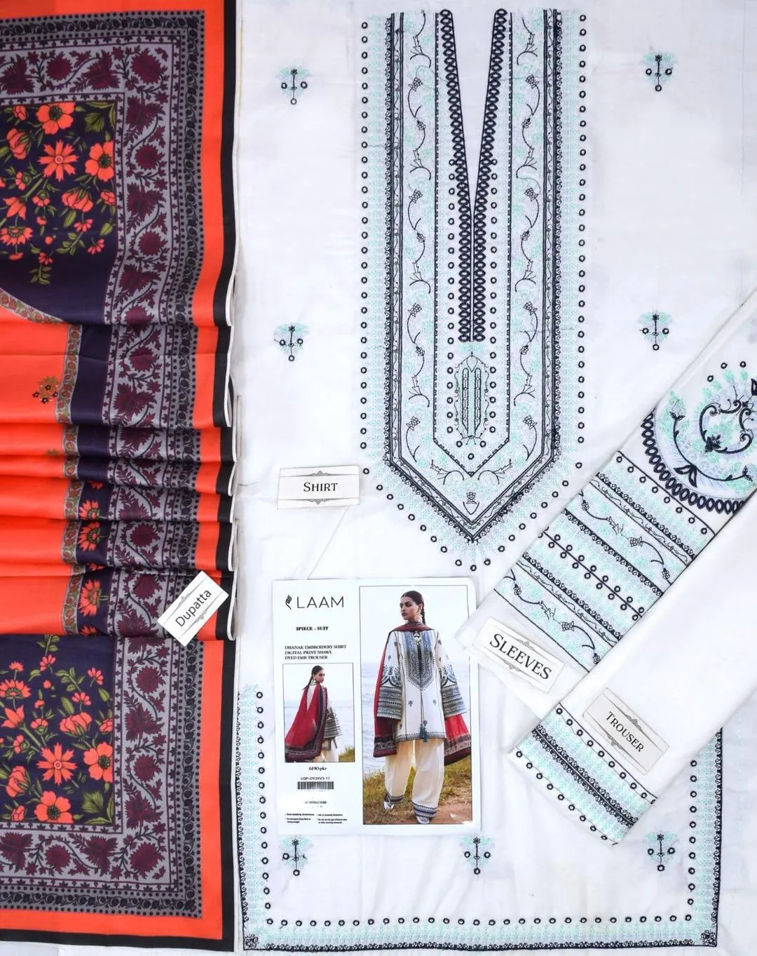 • Shirt Fabric: Dhanak• Pattern: Sequins Embroidered• Shirt Front Pattern: Hand Embroidered• Neckline: Sequins Embroidered• Sleeves Pattern: Embroidered• Daman: Embroidered• Shirt Back Pattern: Plain• Trouser Fabric: Dhanak• Trouser Pattern: Plain• Dupatta Fabric: Dhanak• Dupatta Pattern: Printed• Number Of Pieces: 3 Pcs• Package Includes: 1 x Trouser, 1 x Dupatta, 1 x Shirt• Shirt Cutting: 3 Meter• Trouser Cutting: 2.5 Meter• Dupatta Cutting: 2.5 Meter• Color: White• Note: There might be an error of 1-3 cm due to manual measurement, and slight color differences may occur as a result of varying lighting and monitor effects.• Product Code: MZ59000002215RABG