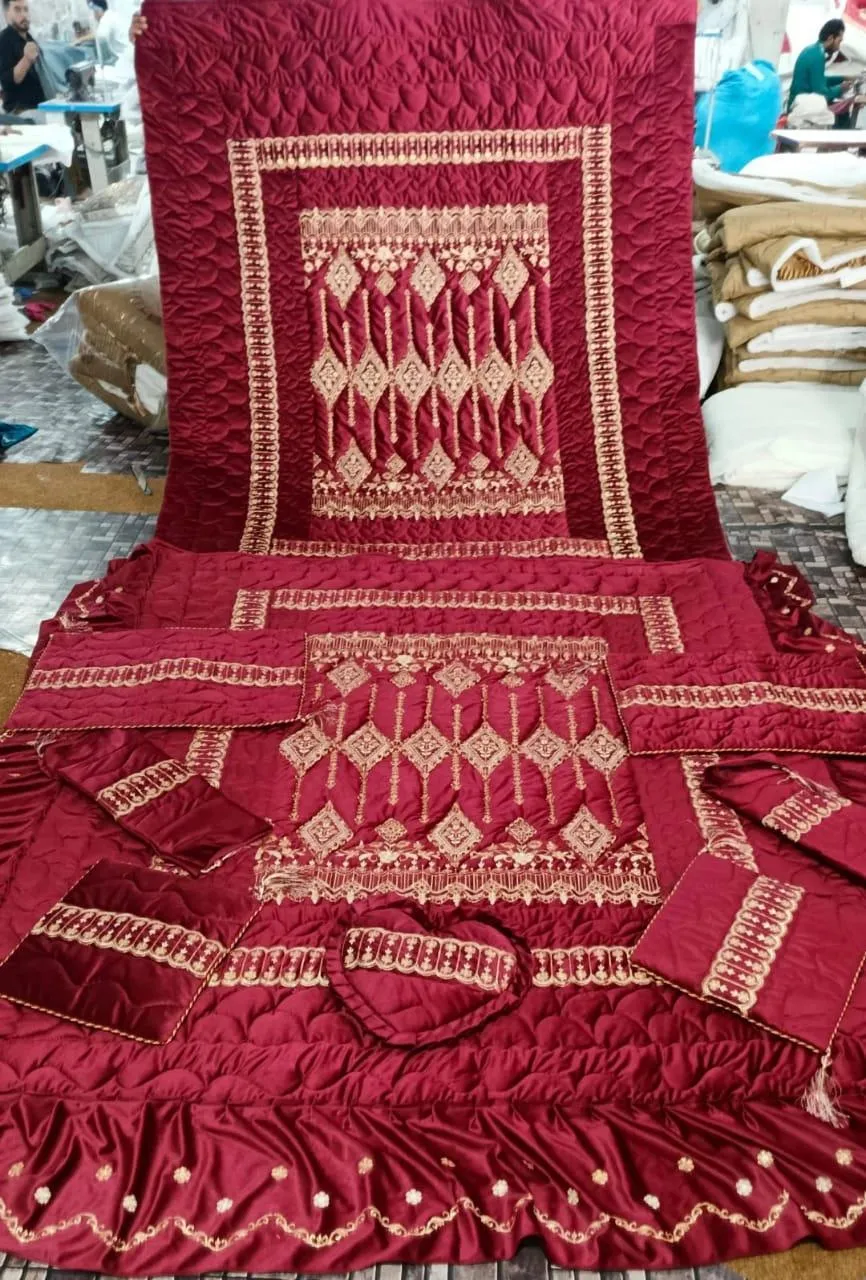 • Fabric: Velvet Jacquard• Pattern: Embroidered• Bed Size: Double Bed• Number Of Pieces: 5 Pcs• Package Includes: 1 x Bedsheet, 2 x Pillow Covers, 1 x Cushion Covers, 1 x Round Pillow Covers• Bedsheet Length: 2.5 Meter• Bedsheet Width: 2.5 Meter• Pillow Length: 28 Inches• Pillow Width: 18 Inches• Color: Red• Note: There might be an error of 1-3 cm due to manual measurement, and slight color differences may occur as a result of varying lighting and monitor effects.• Product Code: MZ1987200007OATS