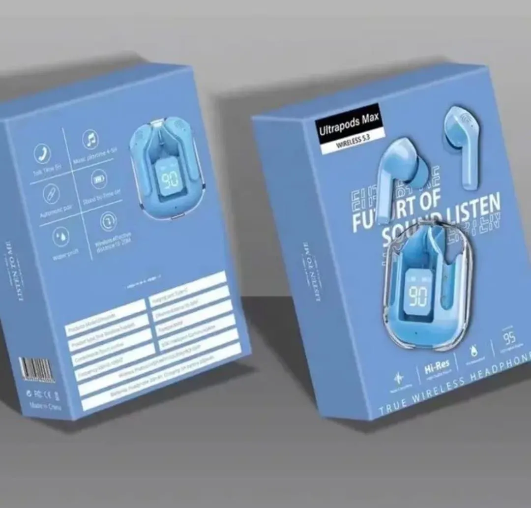 ? Ultrapods Max – Blue TWS Earbuds ? Bluetooth 5.3 | LED Display | Sleek Design ? Stylish blue transparent case & earbuds with digital battery indicator ? ? Post Caption Ideas: ? #UltrapodsMax in blue — Sound that stands out! ? Crystal clear audio + ergonomic comfort ? ? Bluetooth 5.3 for fast pairing & stable connection ? Built-in LED battery display ? Trendy blue transparent design — music meet