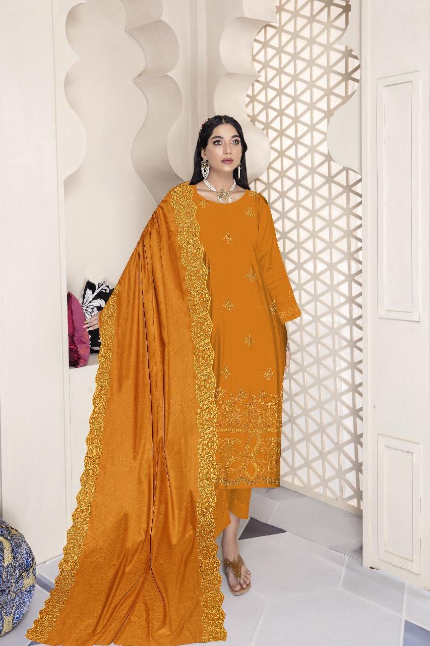 • Shirt Fabric: Dhanak• Pattern: Embroidered• Shirt Front Pattern: Chikankari Embroidered• Neckline: Embroidered• Sleeves Pattern: Embroidered• Daman: Embroidered• Shirt Back Pattern: Plain• Trouser Fabric: Dhanak• Trouser Pattern: Plain• Dupatta Fabric: Dhanak• Dupatta Pattern: Embroidered• Number Of Pieces: 3 Pcs• Package Includes: 1 x Shirt, 1 x Trouser, 1 x Dupatta• Shirt Cutting: 3.25 Yards• Trouser Cutting: 2.5 Yards• Dupatta Cutting: 2.5 Yards• Color: Golden• Note: There might be an error of 1-3 cm due to manual measurement, and slight color differences may occur as a result of varying lighting and monitor effects.• Product Code: MZ89000000052RJFC