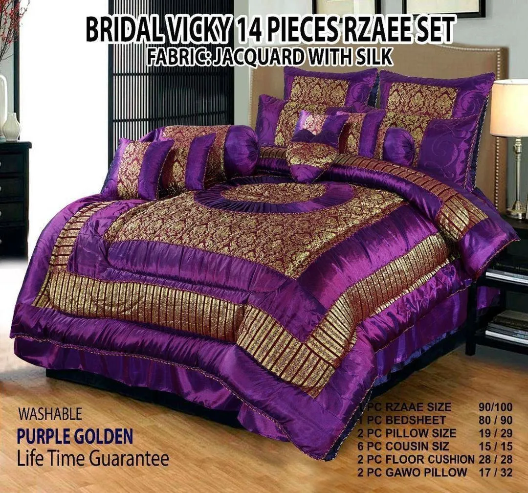 • Fabric: Silk Jacquard• Pattern: Embroidered• Bed Size: Double Bed• Number Of Pieces: 14 Pcs• Package Includes: 1 x Bedsheet, 1 x Razai, 2 x Pillow Covers, 2 x Round Pillow Covers, 2 x Floor Cushion Covers, 6 x Cushion Covers• Bedsheet Length: 100 Inches• Bedsheet Width: 95 Inches• Pillow Length: 29 Inches• Pillow Width: 19 Inches• Cushion Cover Length: 15 Inches• Cushion Cover Width: 15 Inches• Razai Length: 100 Inches• Razai Width: 90 Inches• Round Pillow Cover Length: 32 Inches• Round Pillow Cover Width: 18 Inches• Floor Cushion Cover Length: 29 Inches• Floor Cushion Cover Width: 29 Inches• Color: Purple• 100% Fine Stuff• Adds Elegance to your Bedroom• Excellent value for money• Material, which determines Softness, Warmth, and Breathability• 100% Color Guarantee• Note: There might be an error of 1-3 cm due to manual measurement, and slight color differences may occur as a result of varying lighting and monitor effects.• Product Code: MZ1709201497MATE