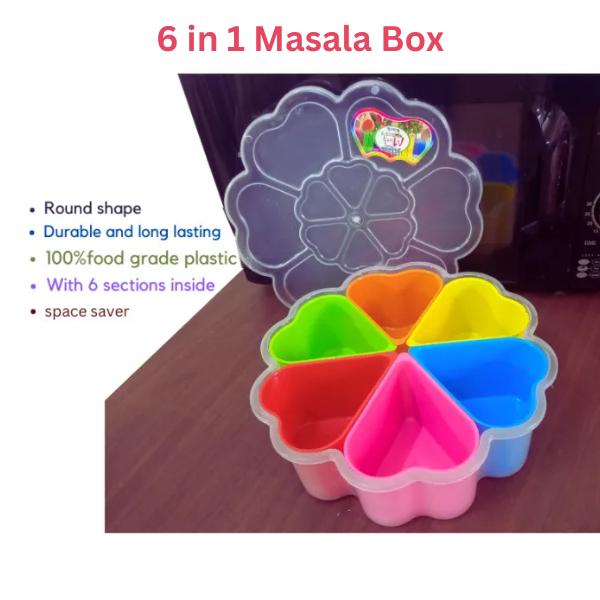 • Material: Plastic• Number Of Pieces: 1 Pc• Color: Multicolor• Package Includes: 1 x Masala Box• 6 in 1 Masala box• Note: There might be an error of 1-3 cm due to manual measurement, and slight color differences may occur as a result of varying lighting and monitor effects.• Product Code: MZ1474200014ZNCN