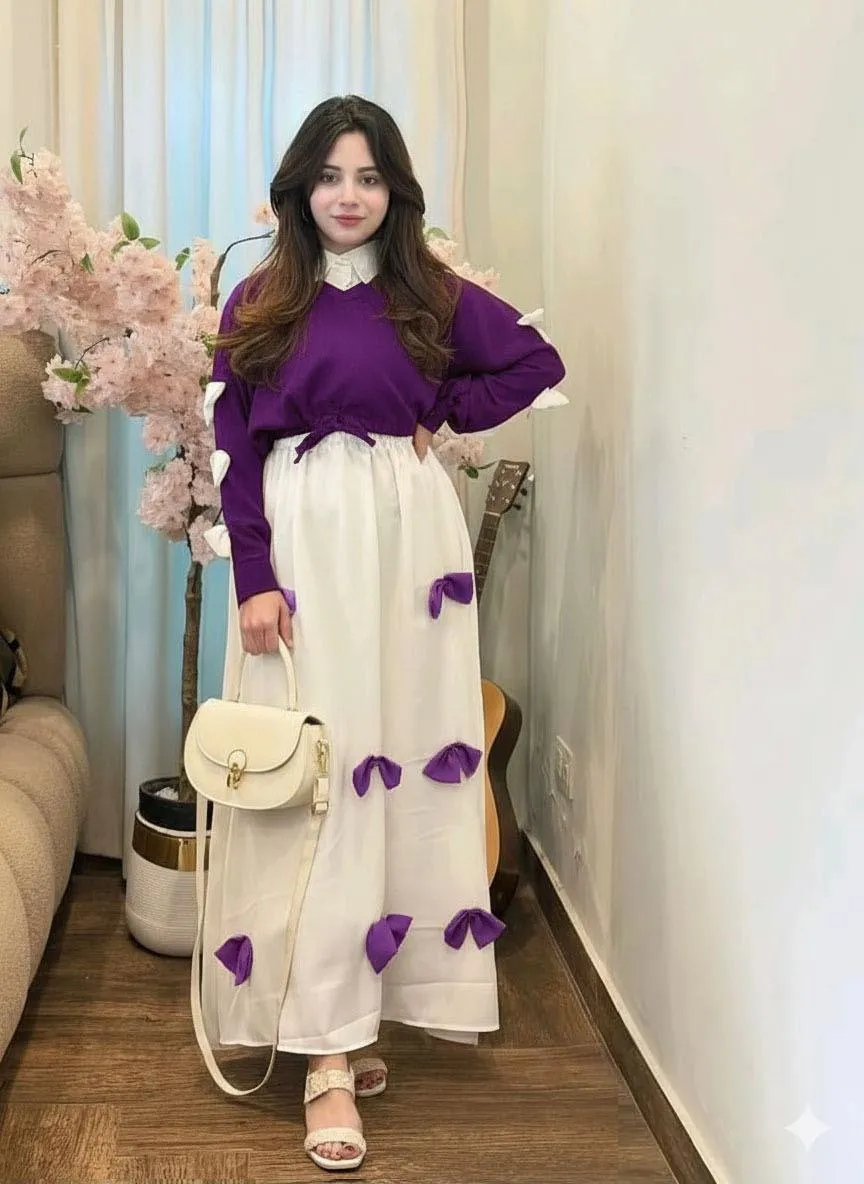 • Fabric: Georgette• Pattern: Calligraphy• Neck Type: Collar• Shirt Pattern: Plain• Available Sizes: Standard Size• Number Of Pieces: 2 Pcs• Package Includes: 1 x Maxi, 1 x Jacket• Shirt Length: 51 Inches• Shirt Chest: 20 Inches• Shirt Shoulder: 15 Inches• Arm Length: 11 Inches• Color: Purple• Premium Georgette Gelegant V Neck Bow Stitched On Sleeves Top With Contrast Bow Stitch On Maxi Long Flare 2Pcs• Size Measurements• Top Chest Size 21/22• Top Length 18/19• Top Stuff Georgette• Contrast Bow Stitched Maxi Chest Size 21/22• Maxi Length 51/52• Maxi Flare 100 Around• Top Stuff Georgette• Maxi Stuff Georgette• Note: There might be an error of 1-3 cm due to manual measurement, and slight color differences may occur as a result of varying lighting and monitor effects.• Product Code: MZ2186200162MBCN