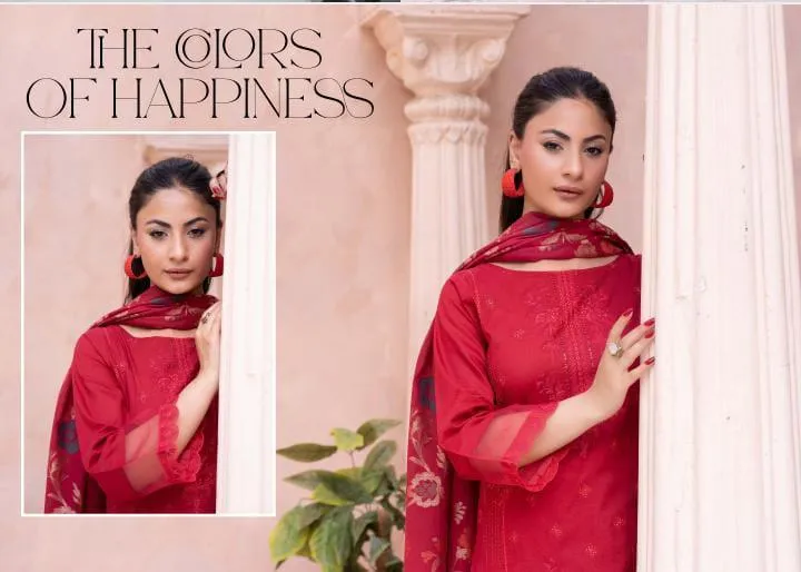 • Shirt Fabric: Lawn• Pattern: Chikankari Embroidered• Shirt Front Pattern: Sequins Embroidered• Neckline: Embroidered• Sleeves Pattern: Embroidered• Daman: Patch Work• Shirt Back Pattern: Plain• Trouser Fabric: Lawn• Trouser Pattern: Embroidered• Dupatta Fabric: Jacquard• Dupatta Pattern: Digital Print• Number Of Pieces: 3 Pcs• Package Includes: 1 x Shirt, 1 x Trouser, 1 x Dupatta• Shirt Cutting: 3 Meter• Trouser Cutting: 2.5 Meter• Dupatta Cutting: 2.75 Meter• Color: Red• ? Original Stock• Note: There might be an error of 1-3 cm due to manual measurement, and slight color differences may occur as a result of varying lighting and monitor effects.• Product Code: MZ59000002341RABG