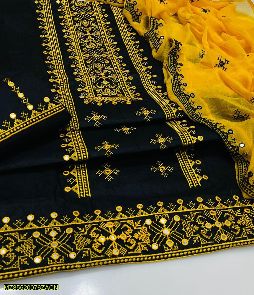 • Fabric: Cotton• Color: Yellow• Pattern: Embroidered• Shirt Front - Pattern: Embroidered• Shirt Back: Plain• Trouser - Pattern: Plain• Dupatta - Fabric: Chiffon• Dupatta - Pattern: Embroidered• Number Of Pieces: 3 Pcs• Package Includes: 1 x Shirt, 1 x Trouser, 1 x Dupatta• Cutting: Shirt: 3 Meter, Trouser: 2.5 Meter, Dupatta: 2.5 Meter• Note: There might be an error of 1-3 cm due to manual measurement, and slight color differences may occur as a result of varying lighting and monitor effects.• Product Code: MZ85520076ZACN