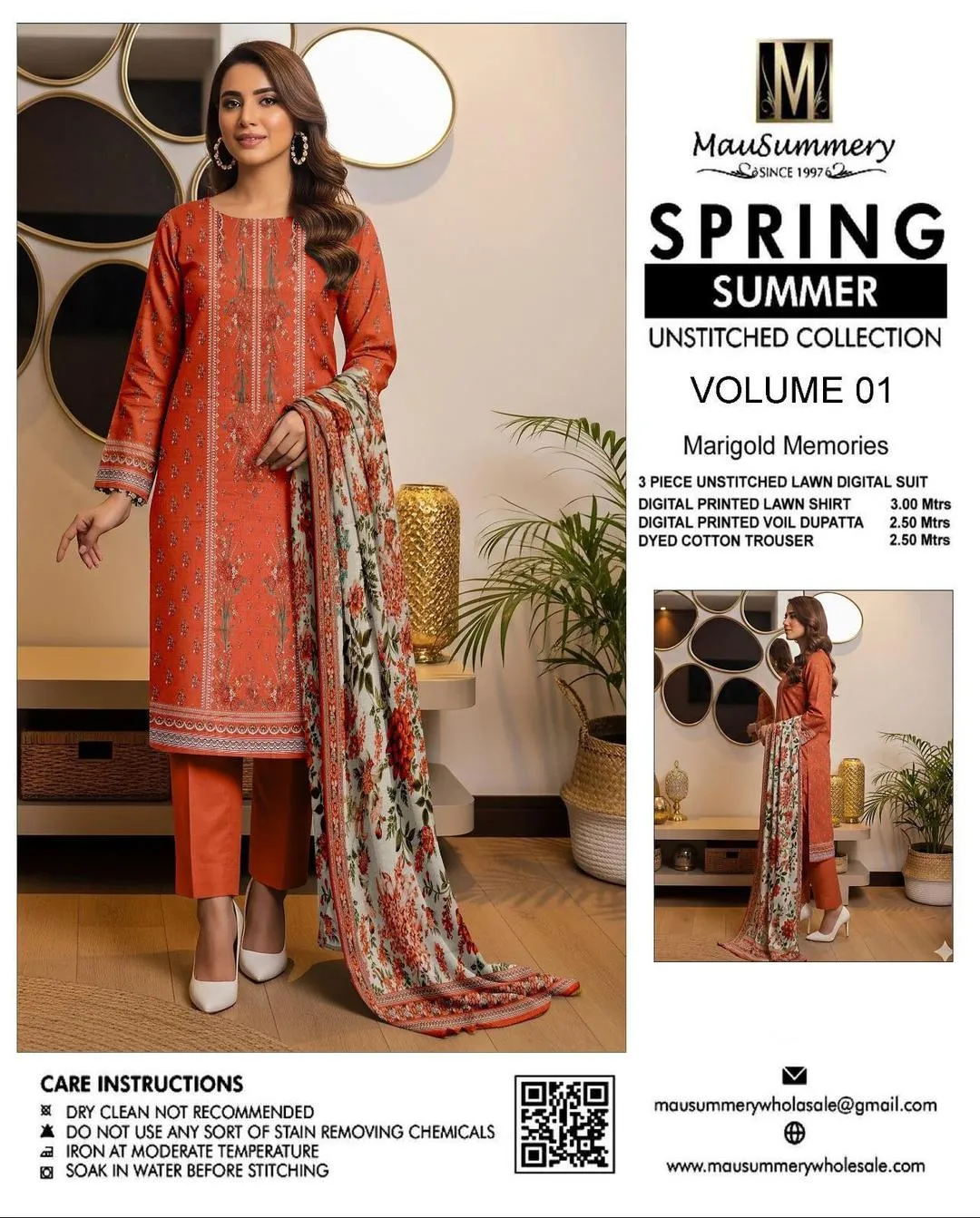 • Shirt Fabric: Lawn• Pattern: Digital Print• Shirt Front Pattern: Digital Print• Neckline: Printed• Sleeves Pattern: Digital Print• Daman: Printed• Shirt Back Pattern: Digital Print• Trouser Fabric: Lawn• Trouser Pattern: Plain• Dupatta Fabric: Lawn• Dupatta Pattern: Printed• Number Of Pieces: 3 Pcs• Package Includes: 1 x Shirt, 1 x Trouser, 1 x Dupatta• Shirt Cutting: 3 Meter• Trouser Cutting: 2.5 Meter• Dupatta Cutting: 2.5 Meter• Color: Orange• Note: There might be an error of 1-3 cm due to manual measurement, and slight color differences may occur as a result of varying lighting and monitor effects.• Product Code: MZ1599201140UNLECG