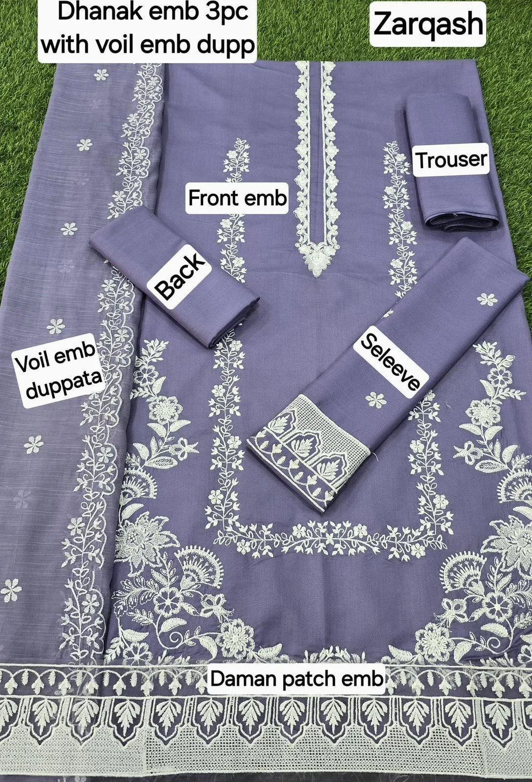 • Shirt Fabric: Dhanak• Pattern: Embroidered• Shirt Front Pattern: Embroidered• Sleeves Pattern: Embroidered• Shirt Back Pattern: Plain• Trouser Fabric: Dhanak• Trouser Pattern: Plain• Dupatta Pattern: Embroidered• Number Of Pieces: 3 Pcs• Package Includes: 1 x Shirt, 1 x Trouser, 1 x Dupatta• Shirt Cutting: 2.5 Gazz• Trouser Cutting: 2 Gazz• Dupatta Cutting: 2.5 Gazz• Color: Purple• Note: There might be an error of 1-3 cm due to manual measurement, and slight color differences may occur as a result of varying lighting and monitor effects.• Product Code: MZ1929200042BTEEAACN