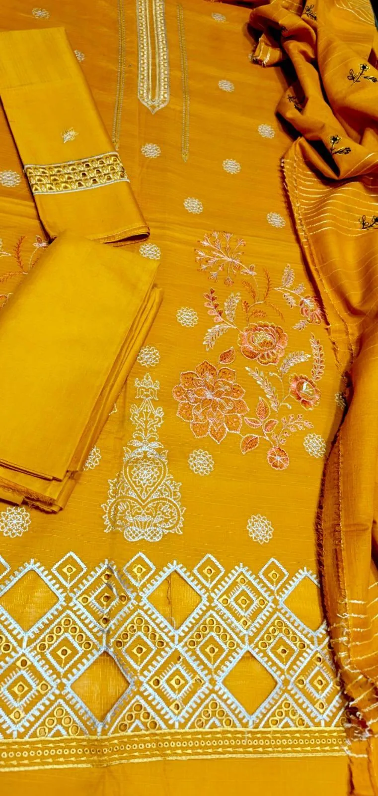 • Shirt Fabric: Dobby Lawn• Pattern: Embroidered• Shirt Back Pattern: Plain• Trouser Fabric: Dobby Lawn• Trouser Pattern: Plain• Dupatta Fabric: Dobby Lawn• Dupatta Pattern: Embroidered• Number Of Pieces: 3 Pcs• Package Includes: 1 x Shirt, 1 x Trouser, 1 x Dupatta• Shirt Cutting: 3.25 Gazz• Trouser Cutting: 2.5 Gazz• Dupatta Cutting: 2.5 Gazz• Color: Mustard• Note: There might be an error of 1-3 cm due to manual measurement, and slight color differences may occur as a result of varying lighting and monitor effects.• Product Code: MZ2194200040SKFS