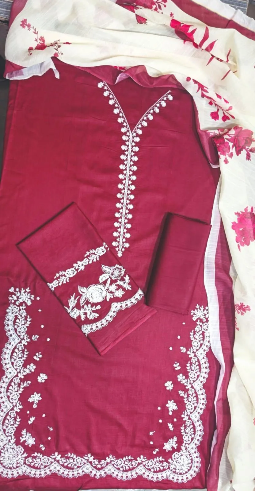 • Shirt Fabric: Lawn• Pattern: Embroidered• Shirt Front Pattern: Embroidered• Shirt Back Pattern: Plain• Trouser Fabric: Lawn• Trouser Pattern: Plain• Dupatta Fabric: Diamond• Dupatta Pattern: Printed• Number Of Pieces: 3 Pcs• Package Includes: 1 x Shirt, 1 x Trouser, 1 x Dupatta• Shirt Cutting: 3.25 Gazz• Trouser Cutting: 2.5 Gazz• Dupatta Cutting: 2.5 Gazz• Color: Maroon• Note: There might be an error of 1-3 cm due to manual measurement, and slight color differences may occur as a result of varying lighting and monitor effects.• Product Code: MZ2194200041SKFS