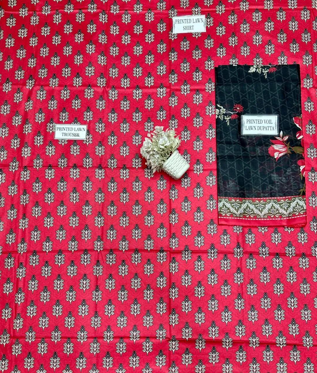 • Shirt Fabric: Lawn• Pattern: Printed• Shirt Front Pattern: Printed• Sleeves Pattern: Printed• Shirt Back Pattern: Printed• Trouser Fabric: Lawn• Trouser Pattern: Printed• Dupatta Fabric: Lawn• Dupatta Pattern: Printed• Number Of Pieces: 3 Pcs• Package Includes: 1 x Shirt, 1 x Dupatta, 1 x Trouser• Shirt Cutting: 3.0 Meter• Trouser Cutting: 2.5 Meter• Dupatta Cutting: 2.5 Meter• Color: Red• Note: There might be an error of 1-3 cm due to manual measurement, and slight color differences may occur as a result of varying lighting and monitor effects.• Product Code: MZ32200002808BSAE