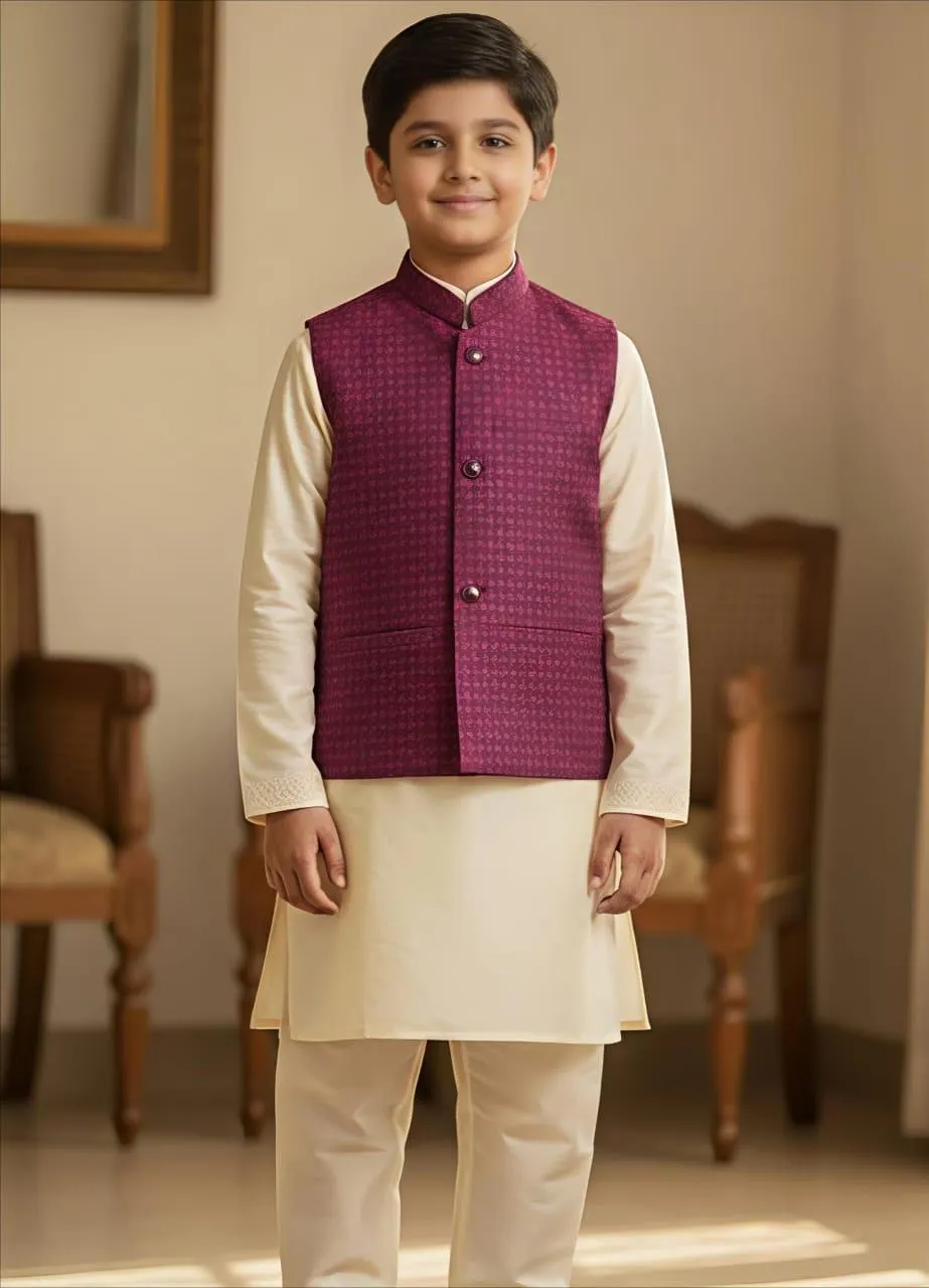 Stylish and comfortable waistcoat designed especially for kids , Made from soft, breathable fabric for all-day. comfort Sleeveless design allows easy movement, Front button closure for a smart and neat look Perfect for parties, weddings, and festive occasions Easy to pair with shirts, kurtas, or trousers
