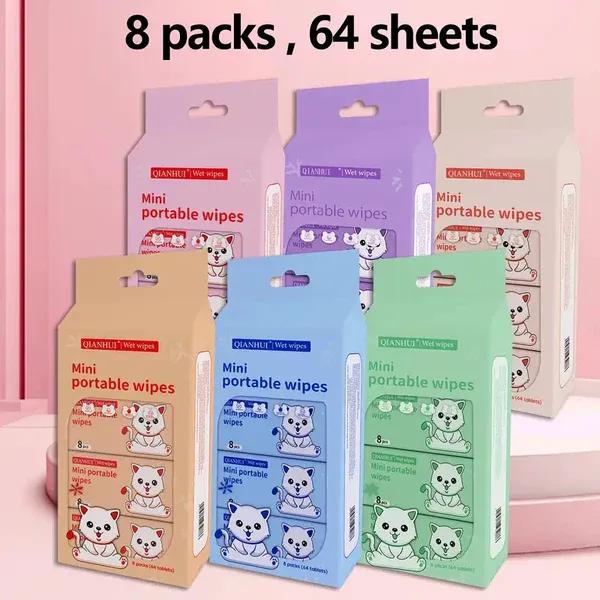 MZ2035200016MTMini Portable Disposable Baby Wipes Water Wipes Baby Skin Care Wet Tissue Pocket Travel Friendly for Household Kids Skin Hand Face Sanitizing Cleaning Moisturizing Total 64 Wipes In 8 Pouch, (Pack Of 1, Multi Colour)