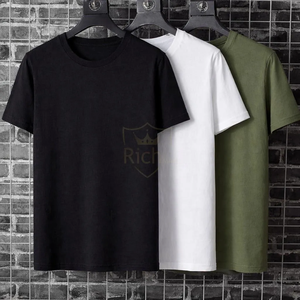• Gender: Men's• Fabric: Cotton• Pattern: Plain• Neck Type: Round Neck• Sizes: Small, Medium, Large, X-Large, 2X-Large• Number Of Pieces: 3 Pcs• Package Includes: 1 x Shirt• Shirt Length: 25 Inches• Shirt Chest: 19 Inches• Shirt Shoulder: 5 Inches• Arm Length: 10 Inches• Color: Multicolor• ? Pack of 3 (Black, White & Olive Green)• ? Soft & breathable premium cotton fabric• ? Classic crew neck design• ? Regular fit for everyday comfort• ? Durable stitching & long-lasting color• ? Perfect for casual wear, gym, layering & daily use Men T-shirt pack of 3, cotton crew neck t-shirt, basic plain t-shirt, casual men tee, black white olive t-shirt, everyday wear shirt, summer cotton shirt, men combo pack shirts, regular fit t-shirt, wardrobe essentials, gym t-shirt men, minimalist fashion tee.• Note: There might be an error of 1-3 cm due to manual measurement, and slight color differences may occur as a result of varying lighting and monitor effects.• Product Code: MZ1009200158RN