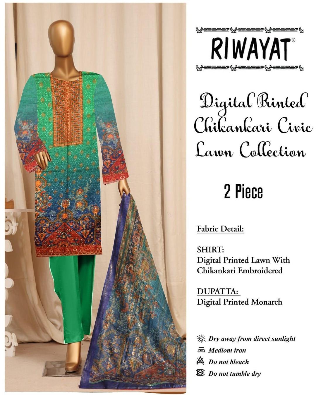 • Shirt Fabric: Lawn• Pattern: Chikankari Embroidered• Shirt Front Pattern: Digital Print• Neckline: Embroidered• Sleeves Pattern: Digital Print• Daman: Embroidered• Shirt Back Pattern: Digital Print• Trouser Fabric: Lawn• Trouser Pattern: Plain• Dupatta Fabric: Digital Printed• Number Of Pieces: 2 Pcs• Color: Multicolor• Package Includes: 1 x 1xShirt Front, 1 x 1xShirt Back & Sleeves, 1 x 1xDupatta• Shirt Cutting: 2.5 Meter• Trouser Cutting: 2.5 Meter• Note: There might be an error of 1-3 cm due to manual measurement, and slight color differences may occur as a result of varying lighting and monitor effects.• Product Code: MZ1506200028QICN
